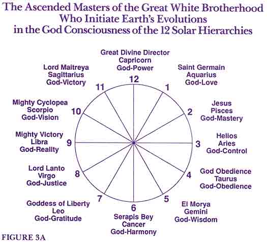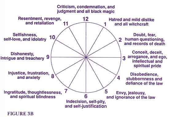 All cycles begin at the hour of 12. Whenever you initiate a cycle or begin a new beginning, break ground on a project or enter into or dissolve partnerships, embark on a journey or set out on an adventure–or whenever you get the idea and start planning for any of the above–you always start on the 12 o’clock line under the hierarchy of Capricorn. The year you are born is always your Capricorn year. From there you take one year to go through each sign of the zodiac. So from age 0 through the first 12 months of your life, you take your initiations under the hierarchy of Capricorn on the 12 o’clock line. You celebrate your first birthday on the 1 o’clock line and take your initiations for the next 12 months under the hierarchy of Aquarius. At age 2 you move on to the testings of the Piscean Masters, and so on until you return to the 12 o’clock line at age 12 for your second round under the Capricorn hierarchy. At age 13 you are back to the 1 o’clock line with the Aquarian adepts, and so it goes, round and round the Cosmic Clock for a lifetime. Within each year you also receive the initiations of the 12 hierarchies month by month around the clock. With each succeeding 12-year cycle you are intended to reach new levels of God-Self mastery. You are either building on the foundations of past victories or having to go over and over failed tests until the soul is strengthened through the God-flames that embody the God-quality on each line. (This method of charting cycles is separate and apart from the method used in astrology to chart your Sun, Moon, rising sign and planets.) The Cosmic Clock predicts the soul’s outpicturing of her psychology through the cycles of returning positive and negative karma. Astrology is also an indicator of returning karma and of the unfinished business and carryovers from past lives. You can use the science of the Cosmic Clock concurrently with personal and planetary astrology charts to discover the nature of your present and ongoing karmic testings and your Christic initiations as well. Using these tools of self-knowledge together with dynamic decrees to invoke the Light to displace the Darkness, the soul who is determined to be a conqueror of self and circumstance can indeed succeed. And the great multitude, which no man could number, of saints who stand before the throne of God and before the Lamb clothed with white robes, <7> is proof that this path is not for the few, but the many. This path is winnable. It says that we can be winners! Every cycle in our lives can be charted on the Cosmic Clock, enabling us to determine under which signs of the zodiac we are being tested. Each sign has its hierarchy of Masters and their God-qualities as well as the human perversions of those qualities (figs. 3a and 3b).