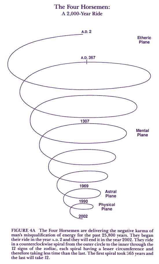 On February 22, 1989, the Lord God gave me another vision of the Four Horsemen of the Apocalypse. I have chosen the occasion of my speaking to you in New York City, May 21, 1989, to give you this revelation. The vision that I received in September 1986 was not the complete ride of the Four Horsemen. I was seeing a slice of a ride that had begun in a.d. 2, which John wrote down in Revelation in a.d. 90. It will conclude in the year 2002. In my February 22 vision, God revealed to me that the Four Horsemen of the Apocalypse have ridden throughout the centuries of the Christian era. John saw them riding through his time and through his history. I am seeing them ride through our time and our history. What is even more astounding is that for the last 2,000 years the Four Horsemen have been delivering a 25,800-year package of personal and planetary karma! This means that the cumulative karma of earth’s evolutions from 11 past ages fell due at the dawn of the Piscean age. Had it not been for the avatar Jesus Christ stepping in to mitigate that karma of 25,800 years in the tradition of the adepts of the East, as Lord Maitreya, Gautama Buddha and Sanat Kumara had borne this karma before him, that karma would have descended in full at the beginning of the Piscean age. But because Jesus chose to take embodiment and to fulfill his mission, this karma was mitigated by percentages and allowed to descend in a series of cycles that would last throughout the age. As the Four Horsemen move through the cycles of time, they appear to be riding around a racetrack. With each cycle–during which they pass through the 12 signs of the zodiac delivering mankind’s karma on the 12 lines of the “Cosmic Clock”–they are coming closer to the center, and the cycles are getting shorter, taking less time to complete. The first cycle, which began 2,000 years ago, took 365 years to complete. The last cycle, which encompasses the decade of the 1990s, will take just 12 years. And so, during their relentless ride of 20 centuries the Four Horsemen have been drawing around us a tighter and tighter coil of energy that has been coming closer and closer to the physical octave. The figure 25,800 years corresponds to cosmic cycles. It also has to do with what we call the New Age. The New Age is related to the phenomenon known in astronomy as the “precession of the equinoxes,” the slow backward rotation of the earth around its polar axis during which the point of the spring equinox moves backwards through the signs of the zodiac. It takes about 25,800 years for the earth to make one complete backward rotation around its polar axis and approximately 2,150 years to go through 30 degrees of the zodiac, or one astrological sign. Since the earth rotates, or precesses, backwards, the order of the ages is also backwards through the zodiac. About the year 2000 b.c. we entered the age of Aries. Two thousand years ago we entered the age of Pisces. And now we are entering the age of Aquarius. As we pass through each of the 12 signs of the zodiac, we receive a dispensation from the Great Central Sun whereby the Four and Twenty Elders and the Four Cosmic Forces impart to the evolutions of the planet a new awareness of self in relationship to a new awareness of God. In the age of Aries we received the gift of knowing God the Father, the I AM THAT I AM; in the age of Pisces, God the Son; and in the age of Aquarius, God the Holy Spirit and God the Mother. We see these signs of man’s awareness of his God appearing throughout these thousands of years in religion East and West. Abraham and the Hebrew patriarchs brought us the awareness of the Most High God (El Elyon) and Almighty God (El Shaddai). They knew the Person of the Father in the Ancient of Days. The Egyptian pharaoh Ikhnaton (c. 1380 b.c.) gave us the understanding of the one God represented as the sun. He saw its many rays ending in human hands, giving and sustaining all life. Moses, who some believe had been trained in the tradition of monotheism while living in Egypt, revealed the I AM THAT I AM as the identity of the Father individualized as the one God. Jesus the Christ, as well as the Buddhas Maitreya and Gautama, gave us the example of the Son as the incarnation of the Christ or the Buddha so that we could realize within ourselves and multiply in grace for others that Word who “was the true Light, which,” as John declared, “lighteth every man that cometh into the world.” <1> Today, we see the reemergence of reverence for the Divine Mother that we knew in past ages. And the Holy Spirit is moving among us fulfilling the Lord’s prophecy through Joel: “I will pour out my Spirit upon all flesh; and your sons and your daughters shall prophesy, your old men shall dream dreams, your young men shall see visions….And whosoever shall call on the name of the Lord I AM THAT I AM shall be delivered.” <2> In order to explain the law of cycles that governs the ride of the Four Horsemen, I need to tell you about the Cosmic Clock, which Mother Mary gave to me in 1963. <3> The Book of Revelation and the Cosmic Clock The Cosmic Clock is relevant to the Book of Revelation. God gave his Revelation to Jesus Christ so that his servants might know beforehand “things which must shortly come to pass.” Our Lord delivered this Revelation to his apostle John the Beloved, “sent and signified by his angel.” <4> The Book of Revelation is God’s gift to all who have answered his call to walk the path of initiation unto Christhood in the footsteps of our Elder Brother Jesus Christ. Its 22 chapters are a study in the psychology of the soul and the soul’s testings under the hierarchy of the Great White Brotherhood. These she must master on her homeward path leading to reunion with Alpha and Omega, the Father-Mother God. Mother Mary has taught me how to chart the 404 verses that make up the chapters of Revelation on the 12 lines of the Cosmic Clock. The Blessed Mother told me to pl