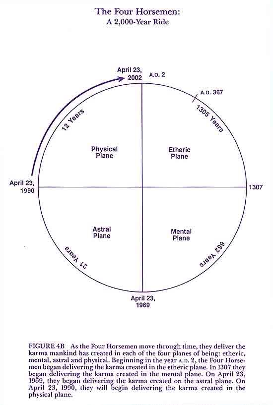 The karma they are delivering is the karma mankind has created in each of the four planes of being: the etheric, mental, astral and physical (fig. 4b) In the year a.d. 2 they began delivering mankind’s karma created in the etheric plane. In 1307 they began delivering mankind’s karma created in the mental plane. On April 23, 1969, they began delivering mankind’s karma created in the astral plane. And on April 23, 1990, the Four Horsemen will begin delivering mankind’s karma created in the physical plane through the physical body. When the karma is descending in the etheric quadrant, only 25 percent of it is physical. When the karma is descending in the mental quadrant, 50 percent of it is physical. When the karma is descending in the astral quadrant, 75 percent of it is physical. And when it is descending in the physical quadrant, the entire force and weight of that karma descends. Another way of looking at it is: When you create karma in your etheric body, 75 percent of it returns to you in your etheric body and 25 percent of it returns to you in your physical body. When you create karma in the mental body, you receive 50 percent of it in your mental body and 50 percent in your physical body. When you create karma in your emotional body, you receive 25 percent of it in your emotional body and 75 percent of it in your physical body. And when you create karma in your physical body, you receive 100 percent of it in your physical body. Now, the equations of karma are complex. The number of permutations and variables is almost infinite. What I am giving you is an oversimplification; but it is a needed one. Karma returns like ocean waves. This formula of the ride of the Four Horsemen will not tell you when each ripple and eddy of your personal karma will pass by; but it will give you a pretty good idea of when to expect tidal waves and when it is imperative to get out of the way of tidal waves and move on to the higher ground of your I AM Presence. At a subconscious level, the evolutions of earth sense the wave of returning karma that will come crashing down April 23, 1990, or thereabouts. Times have gotten a lot tougher lately. People talk about the heavy vibrations of the cities and of the earth itself. This is the weighing in upon us of the karma that is layered in the etheric, the mental, the astral and the physical planes. We can feel it as a weight upon the heart and the spirit, although we might be perfectly well physically. The very pores of the earth are clogged! But not all of us are even physically well. For the last plagues are already spilling over into the physical plane. And they cover our four lower bodies just like the oil from the Exxon Valdez and subsequent oil spills covers the sea, the rocks and the wildlife. And the calamities we have seen are a foreshadowing of what will come to pass on April 23, 1990, and following. We might use the expression “You ain’t seen nothin’ yet.” As bad as things already are, there is more personal and planetary karma waiting in the wings for its April 23 cue. Before karma becomes physical it is much easier to turn back. You can turn back cancer and dread diseases such as AIDS when the karma that causes them to outpicture in the physical body is yet lodged in the etheric, mental and astral bodies. You can invoke the sacred fire of God to consume the cause and core of your karma before you reap and weep in the physical, where karma kills day in, day out. The violet flame is the alchemist’s universal solvent and the physician’s panacea for all our karmic ailments. But when these diseases become physical, although the violet flame does work, it becomes a matter of whether or not the karmic time will run out before the violet flame can complete the necessary cycles of transmutation. And so it goes with world karma as well. The earth body is already sick with a supersaturated solution of karmic salts. We have had the last 50 years to clean up the environment with the violet flame on an as-you-go basis. If we had used the violet flame side by side with protective environmental measures, we would be ready to start shoveling in this 12-year cycle when our physical karma gets dumped on our doorstep. But since the earth patient is so overloaded with toxins, it’s beginning to look like only cataclysm can adjust the cycles and restore the balance of Light in her four lower bodies and those of her people. It takes a Herculean effort to fight off the invaders of the earth body. And there aren’t too many Herculeses around these days. We may be karmic victims of our diseases, or we may be victims of antichrists who have mismanaged the health sciences and the field of medicine and put chemicals into our food and into everything else. We may be victims of a conspired or accidental introduction of the AIDS virus into our bodies by scientists, researchers or public health officials. (If you are interested in that topic, I would suggest you get the video- or audiotapes of my Summit University Forum with Dr. Robert Strecker and others who discussed their theories about AIDS as a man-made virus. <8>) In ages past, as well as in the present, mankind have been victims of the experiments of geneticists and even aliens, <9> not necessarily as a result of their karma but as a result of their vulnerability–because they have forsaken their God and disobeyed his laws. If we were not vulnerable within ourselves, we would not be subject to the abuses of the powers that be. So all is not well in the earth, and we have yet to see the full impact of the ride of the Four Horsemen delivering their karma in the physical octave. April 23, 2002, marks the end of the ride of the Four Horsemen through the physical quadrant and the end of the return of the karma of 25,800 years. Remember, we all have positive karma. The good and the beautiful of our karma is sealed in our Causal Body. It’s there as a positive momentum to see us through the hard times. Yes, we